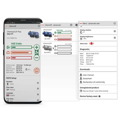 All the settings for your CleanAIR device in one place, easily accessible through Bluetooth. This gives you a great tool for managing settings like headtops, filter type, filter timer, and much more. The Chemical 2F user manual and declaration of conformity are also directly accessible from the app.