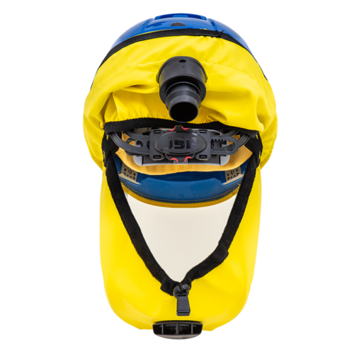 This safety helmet combines respiratory protection with protection of the head, face and ears (optional). The long hood provides protection down to the shoulders.