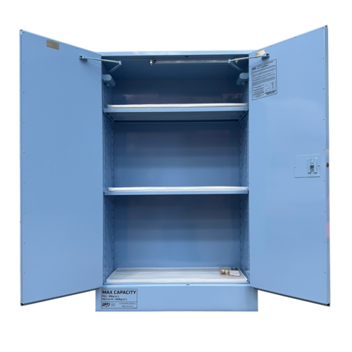 Each shelf is supplied with plastic spill trays to contain small spills and leakages