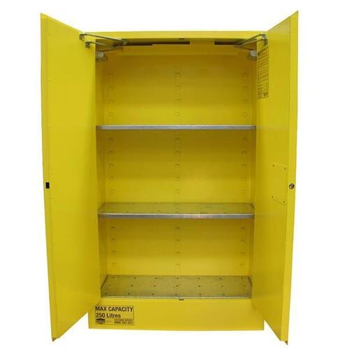 Double door flammable liquid storage cabinet with 250L capacity.