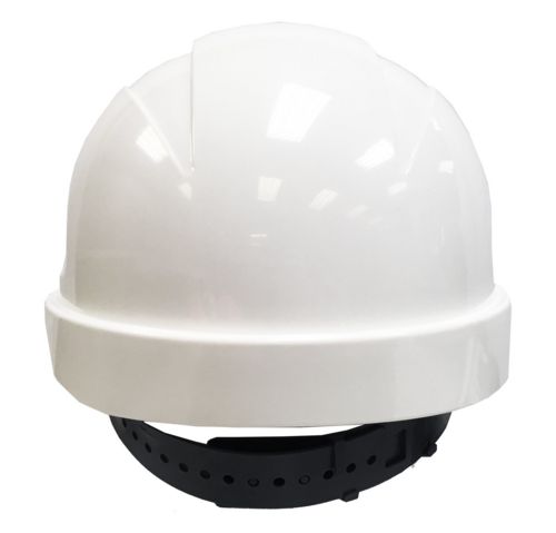 Mid-peak vented industrial safety hard hat, sliplock/pinlock adjustable harness
