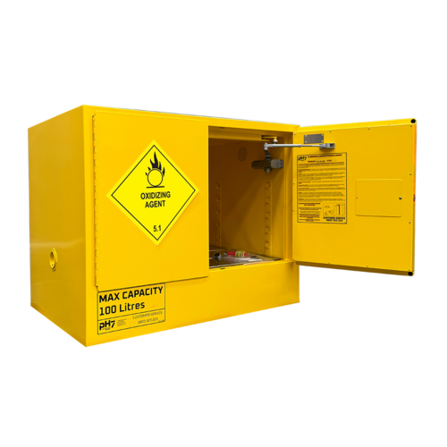 Suitable for storage of class 5.1 oxidizing agents in liquid or solid form including chemicals such as hypochlorite-inorganic, hydrogen peroxide, perchlorites-inorganic and potassium nitrate.